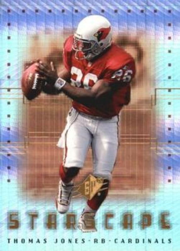 The Thomas Jones 2000 SPx #RS1 Rookie Starscape card is 1 of 5 Thomas Jones' card variations in the 2000 SPx set being tracked by Sports Card Investor, including Base /1350, Spectrum /25, SPxcitement, and Winning Materials.