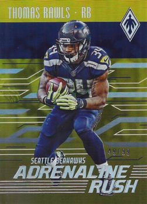 The Thomas Rawls 2016 Phoenix #AR-TR Adrenaline Rush - Yellow /99 card is 1 of 17 Thomas Rawls' card variations in the 2016 Phoenix set being tracked by Sports Card Investor, including Base /249, Pink, Red, Orange /99, and Yellow /49.