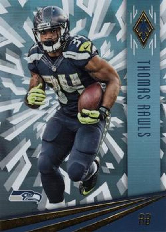The Thomas Rawls 2016 Phoenix #86 Base /249 card is 1 of 17 Thomas Rawls' card variations in the 2016 Phoenix set being tracked by Sports Card Investor, including Pink, Red, Orange /99, Yellow /49, and Green /10.