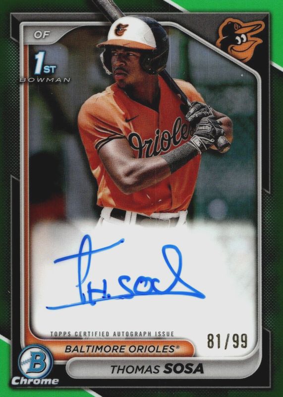 2024 Bowman Chrome Thomas Sosa 1st Green Refractor Auto /99 Orioles Prospect