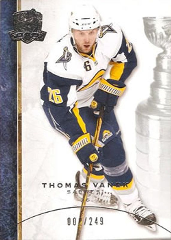 The Thomas Vanek 2008 Upper Deck The Cup #4 Base /249 card is 1 of 15 Thomas Vanek's card variations in the 2008 Upper Deck The Cup set being tracked by Sports Card Investor, including Artist Proof Foundations Patches, Gold Rainbow /67, Gold /25, Black /1, and Honorable Numbers /27.