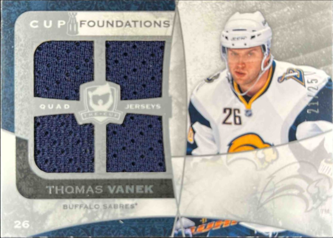The Thomas Vanek 2008 Upper Deck The Cup #CF-TV Foundations Jerseys /25 card is 1 of 15 Thomas Vanek's card variations in the 2008 Upper Deck The Cup set being tracked by Sports Card Investor, including Base /249, Artist Proof Foundations Patches, Gold Rainbow /67, Gold /25, and Black /1.