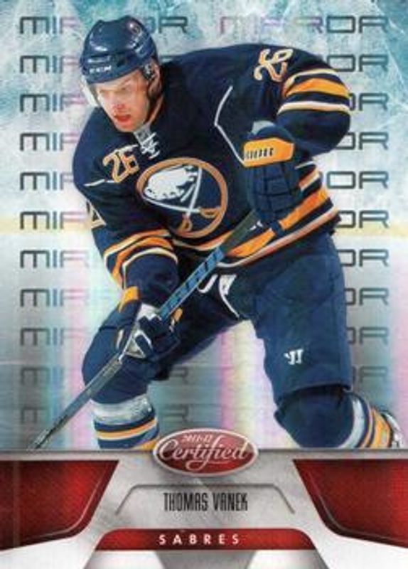 The Thomas Vanek 2011 Certified #51 Mirror Red /199 card is 1 of 33 Thomas Vanek's card variations in the 2011 Certified set being tracked by Sports Card Investor, including Base /499, Totally Silver, Mirror Red Materials Dual /150, Mirror Blue /99, and Mirror Blue Materials /99.