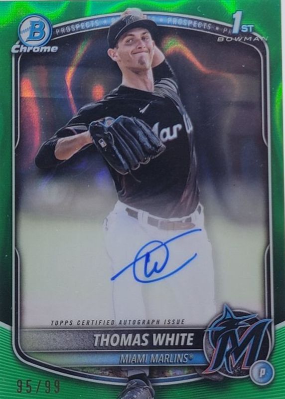 Best Prices Available For Sale of Thomas White 2025 Bowman #CPA-TW Chrome Prospect Auto - Green Lava Refractor /99 (1st)