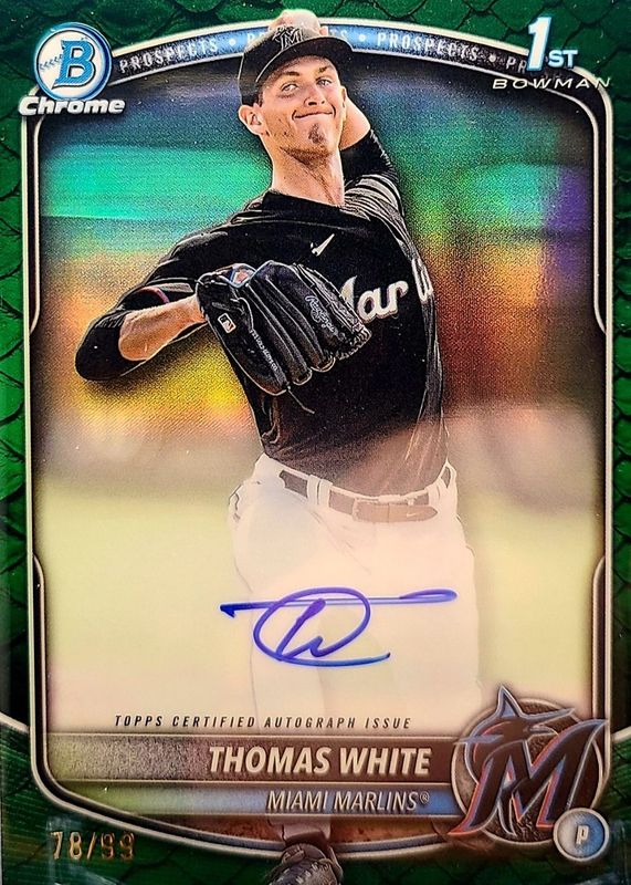 Best Prices Available For Sale of Thomas White 2025 Bowman #CPA-TW Chrome Prospect Auto - Green Refractor /99 (1st)
