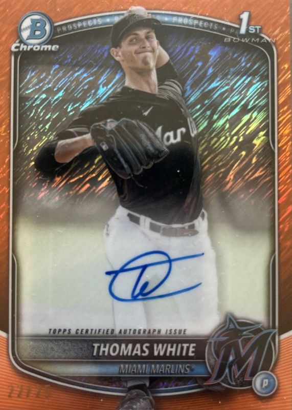 2025 Bowman Thomas White /25 Orange Shimmer Chrome Auto #CPA-TW - Marlins