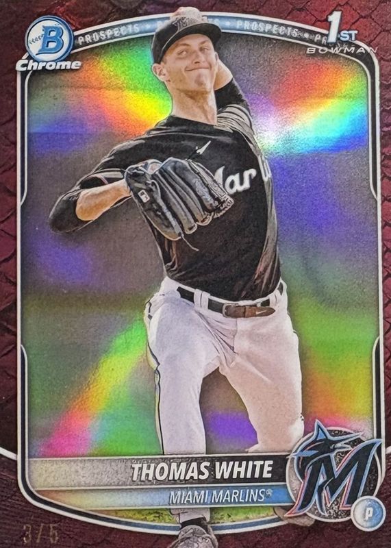 Thomas White 2025 Bowman #BCP-69 Chrome Prospects - Reptilian Red Refractor /5 (1st) RAW Price Guide
