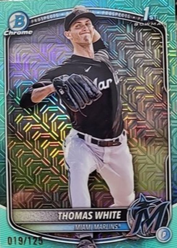 The Thomas White 2025 Bowman Mega Box #BCP-69 Chrome Prospects - Aqua Refractor /125 (1st) card in Raw condition has not changed in price in the last 30 days and was last sold for $25.00 .