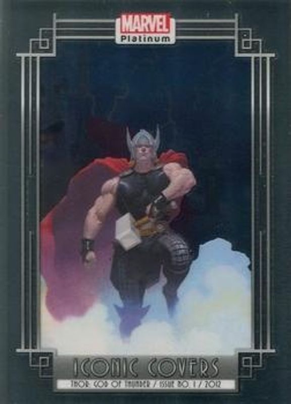 The Thor 2023 Upper Deck Marvel Platinum #IC20 Iconic Covers card is 1 of 119 Thor's card variations in the 2023 Upper Deck Marvel Platinum set being tracked by Sports Card Investor, including #134 Base, #86 Base, #135 Base, #86 Black Rainbow, and #134 Black Rainbow.