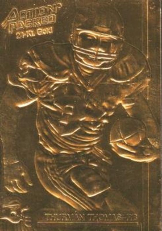 The Thurman Thomas 1992 Action Packed #284 Mint /500 card is 1 of 6 Thurman Thomas' card variations in the 1992 Action Packed set being tracked by Sports Card Investor, including #15 Base, #284 Base, #92A Prototypes, #15 Mint /500, and #6G 24 Kt. Gold.