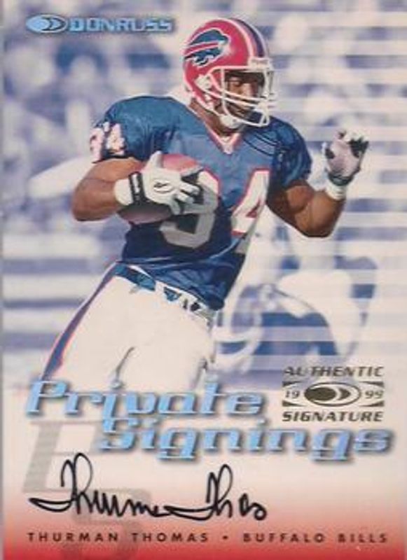 The Thurman Thomas 1999 Donruss #NNO Private Signings card is 1 of 4 Thurman Thomas' card variations in the 1999 Donruss set being tracked by Sports Card Investor, including Base, Stat Line Career /223, and Stat Line Season /14.