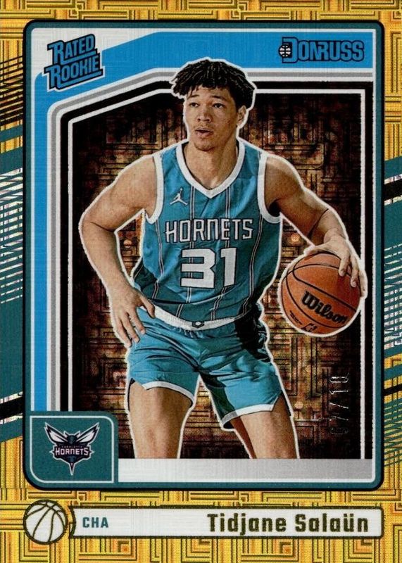 The Tidjane Salaun 2024 Donruss #229 Choice Gold /10 Rookie card in Raw condition has not changed in price in the last 30 days and was last sold for $24.50 .