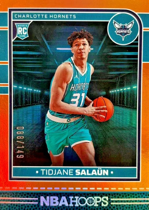 This card is 1 of 116 Tidjane Salaun's card variations in the 2024 Hoops set being tracked by Sports Card Investor, including Base, Tribute, Blue, Impulse, and Premium.