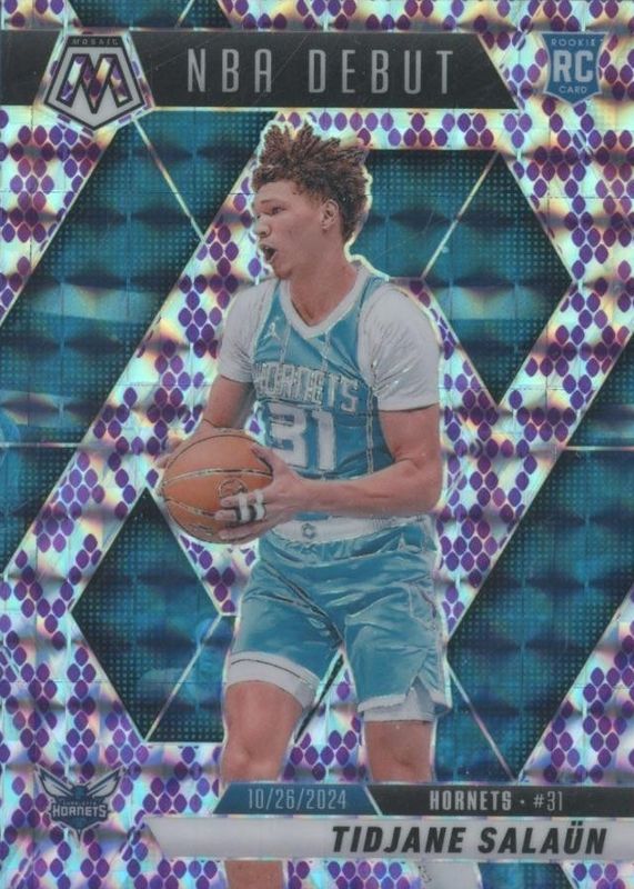 The Tidjane Salaun 2024 Mosaic #268 NBA Debut - Snakeskin Purple /24 Rookie card in Raw condition has not changed in price in the last 30 days and was last sold for $12.50 .