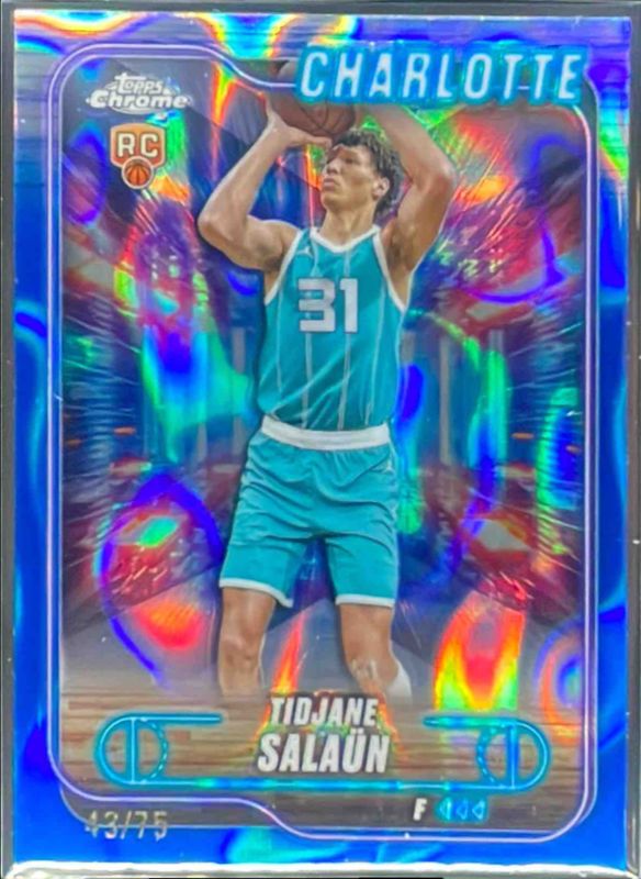 The Tidjane Salaun 2024 Topps Chrome #148 Blue Lava Refractor /75 Rookie card is 1 of 104 Tidjane Salaun's card variations in the 2024 Topps Chrome set being tracked by Sports Card Investor, including Base, Blue Basketball Refractor, Magenta Refractor, Negative Refractor, and Pink Basketball Refractor.