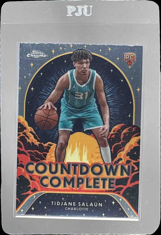 The Tidjane Salaun 2024 Topps Chrome #CC-15 Countdown Complete Rookie card is 1 of 104 Tidjane Salaun's card variations in the 2024 Topps Chrome set being tracked by Sports Card Investor, including Base, Blue Basketball Refractor, Magenta Refractor, Negative Refractor, and Pink Basketball Refractor.