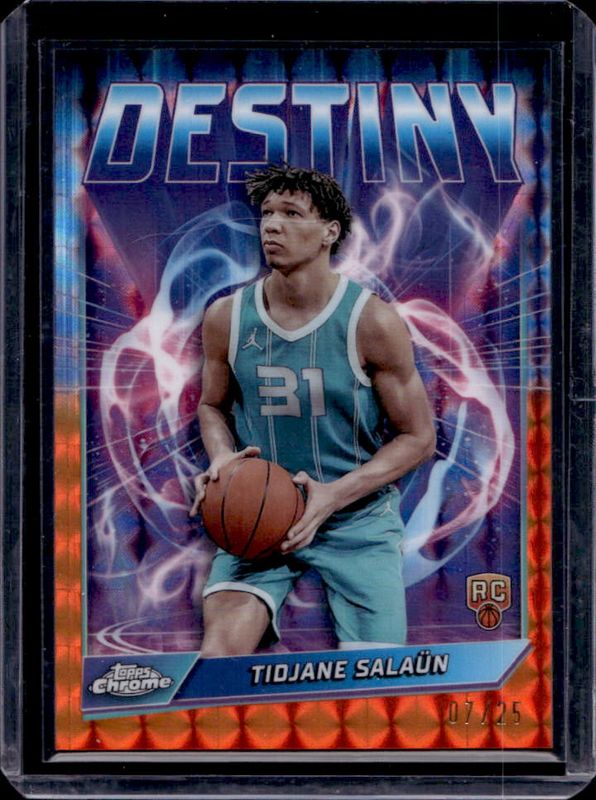 The Tidjane Salaun 2024 Topps Chrome #D-5 Destiny - Orange Geometric Refractor /25 Rookie card is 1 of 104 Tidjane Salaun's card variations in the 2024 Topps Chrome set being tracked by Sports Card Investor, including Base, Blue Basketball Refractor, Magenta Refractor, Negative Refractor, and Pink Basketball Refractor.