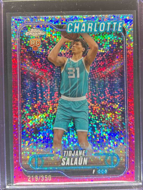 The Tidjane Salaun 2024 Topps Chrome #148 Magenta Speckle Refractor /350 Rookie card is 1 of 104 Tidjane Salaun's card variations in the 2024 Topps Chrome set being tracked by Sports Card Investor, including Base, Blue Basketball Refractor, Magenta Refractor, Negative Refractor, and Pink Basketball Refractor.