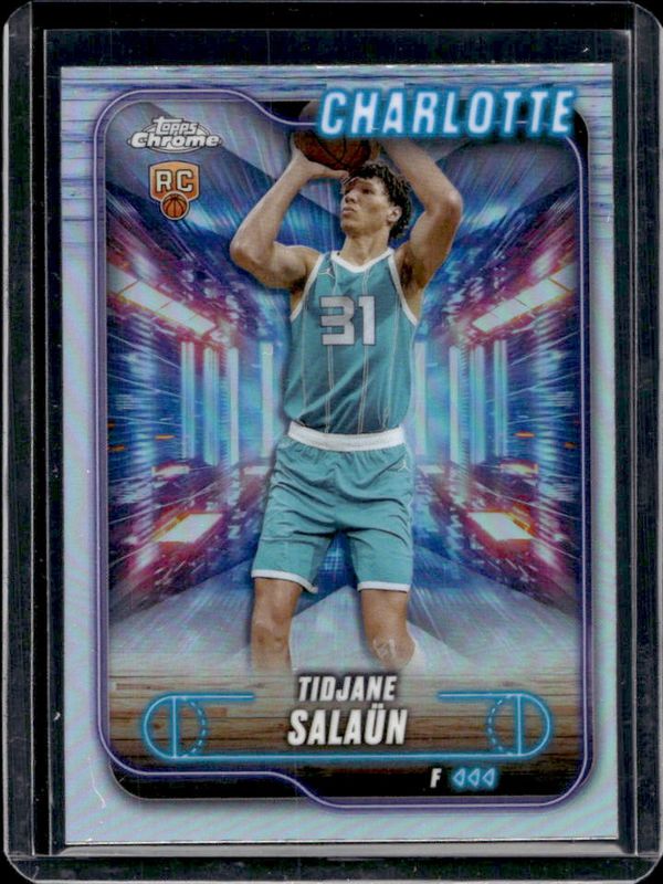 The Tidjane Salaun 2024 Topps Chrome #148 Refractor Rookie card is 1 of 104 Tidjane Salaun's card variations in the 2024 Topps Chrome set being tracked by Sports Card Investor, including Base, Blue Basketball Refractor, Magenta Refractor, Negative Refractor, and Pink Basketball Refractor.