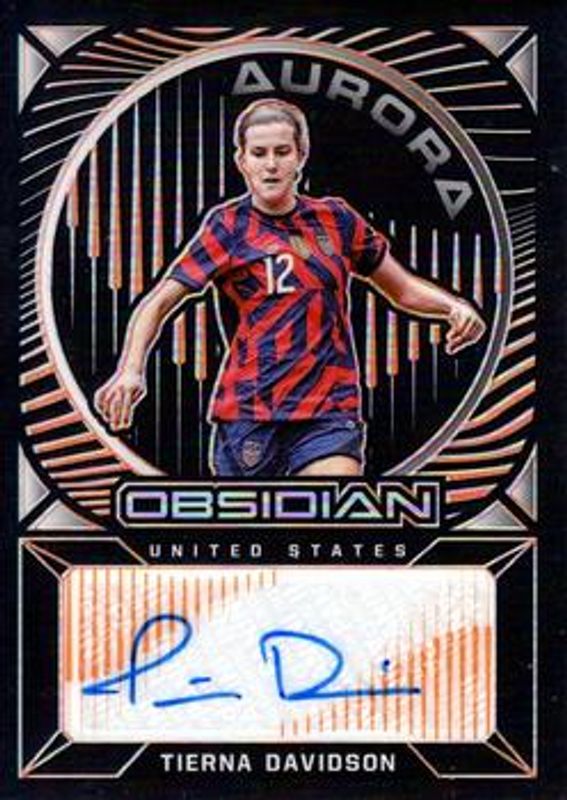 The Tierna Davidson 2021 Obsidian #AU-TDN Aurora Autographs - Electric Etch Orange /50 card is 1 of 9 Tierna Davidson's card variations in the 2021 Obsidian set being tracked by Sports Card Investor, including Aurora Autographs /149, Aurora Autographs - Electric Etch Purple /75, Aurora Autographs - Electric Etch Red Pulsar /44, Aurora Autographs Electric Etch - Red /25, and Aurora Autographs - Electric Etch Yellow /10.