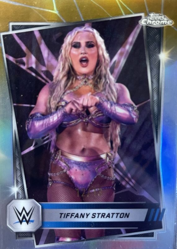 Best Prices Available For Sale of Tiffany Stratton 2025 Topps Chrome WWE #182 Black & Gold Refractor