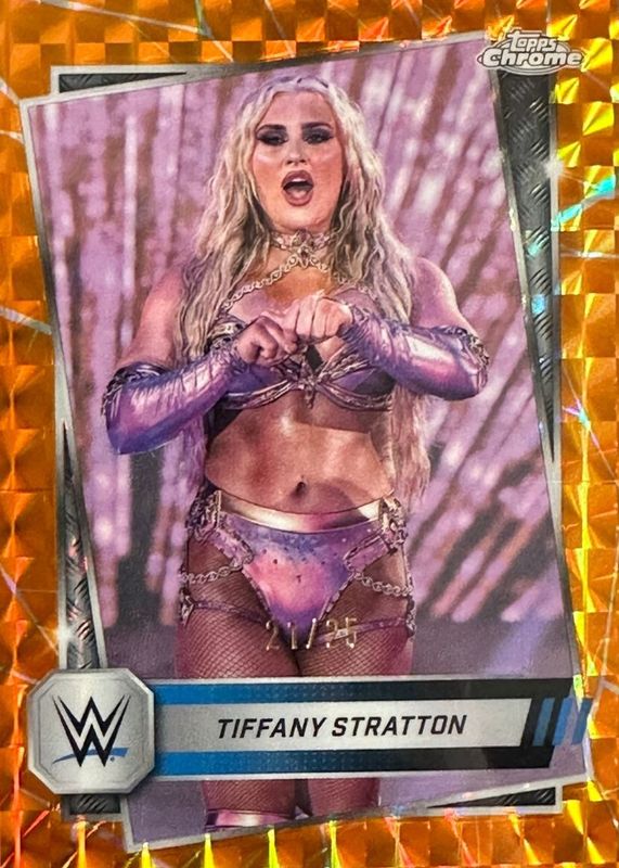 Best Prices Available For Sale of Tiffany Stratton 2025 Topps Chrome WWE #182 Orange Geometric Refractor /25