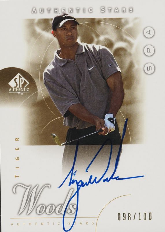 The Tiger Woods 2001 SP Authentic #45 Authentic Stars Autographs - Gold /100 Rookie card in Raw condition has not changed in price in the last 30 days and was last sold for $23,751.01 .