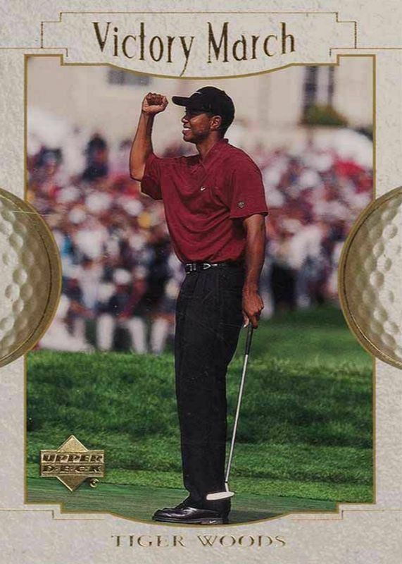 The Tiger Woods 2001 Upper Deck #151 Victory March Rookie card is currently the 7th most trending card in Golf.