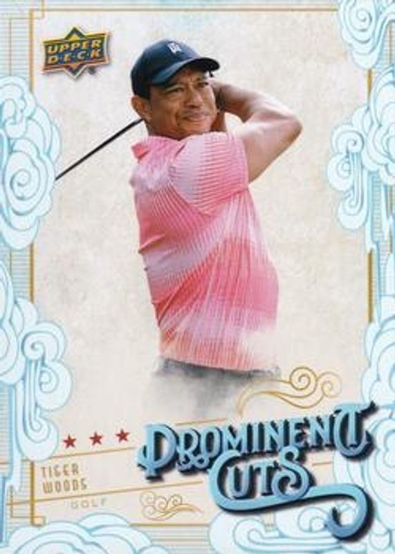 The Tiger Woods 2023 Upper Deck NSCC Wrapper Redemption #PC-9 Prominent Cuts card is 1 of 3 Tiger Woods' card variations in the 2023 Upper Deck NSCC Wrapper Redemption set being tracked by Sports Card Investor, including Prominent Cuts Blue, and VIP Prominent Cuts Autographs /15.