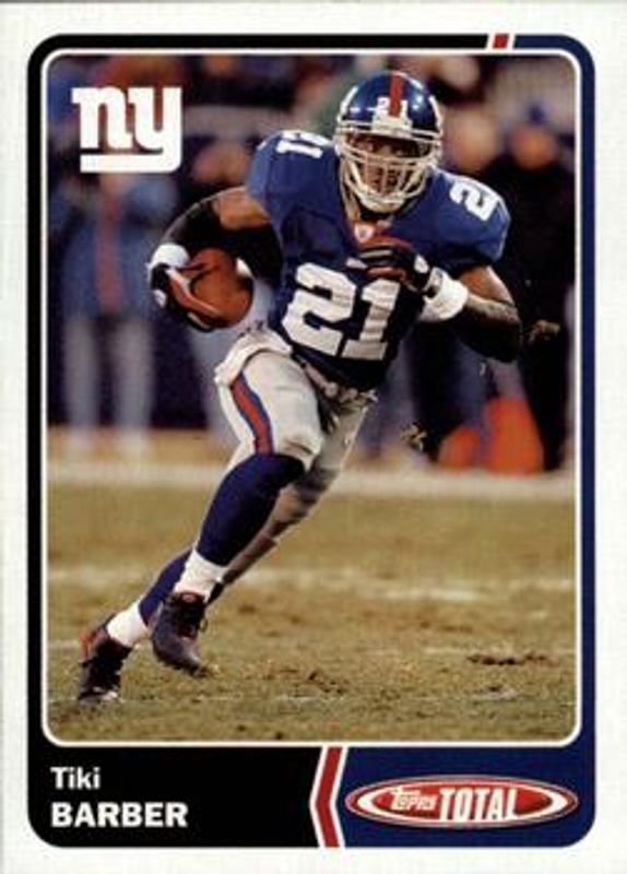 The Tiki Barber 2003 Topps Total #245 Base card is 1 of 2 Tiki Barber's card variations in the 2003 Topps Total set being tracked by Sports Card Investor, including Silver.