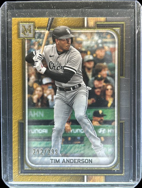 The Tim Anderson 2023 Topps Museum Collection #74 Gold /299 card is 1 of 23 Tim Anderson's card variations in the 2023 Topps Museum Collection set being tracked by Sports Card Investor, including Base, Copper, Sapphire /150, Amethyst /99, and Ruby /50.