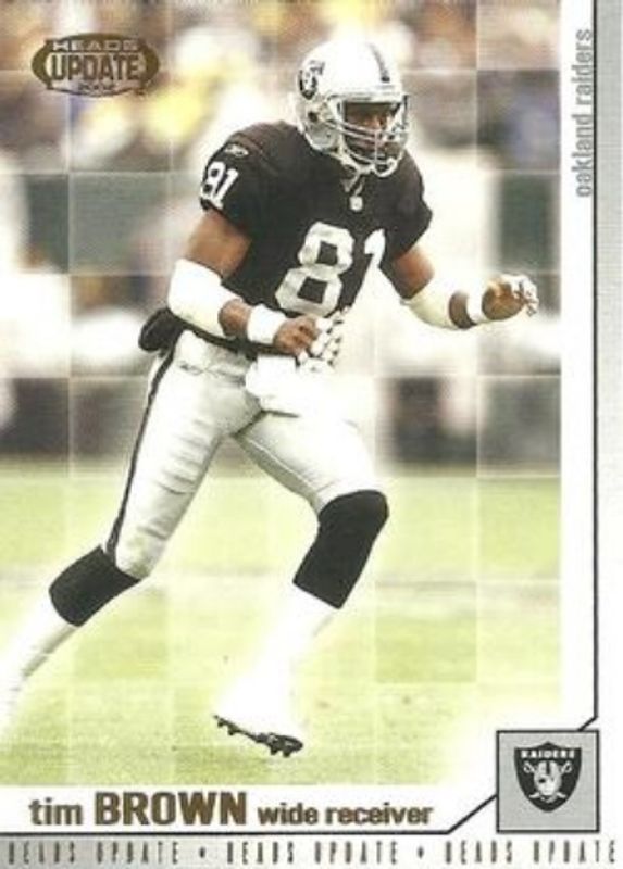 The Tim Brown 2002 Pacific Heads Update #121 Base card is 1 of 5 Tim Brown's card variations in the 2002 Pacific Heads Update set being tracked by Sports Card Investor, including Blue, Red, Game Worn Jersey /215, and Game Worn Jersey - Gold /25.