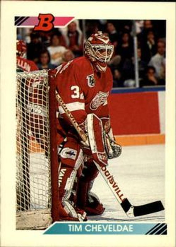The Tim Cheveldae 1992 Bowman #420 Base card is 1 of 2 Tim Cheveldae's card variations in the 1992 Bowman set being tracked by Sports Card Investor, including Base.