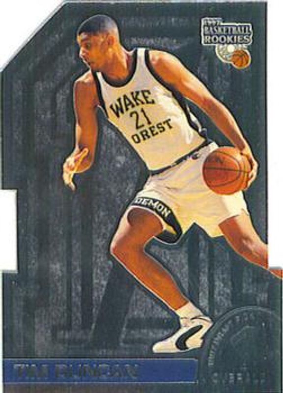 The Tim Duncan 1997 Score Board Rookies #1 #1 Die Cuts card is 1 of 12 Tim Duncan's card variations in the 1997 Score Board Rookies set being tracked by Sports Card Investor, including #72 Base, #1 Base, #57 Base, #61 Base, and #62 Base.