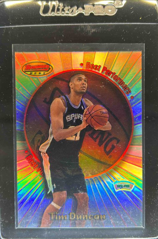 The Tim Duncan 1998 Bowman's Best #BP5 Performers - Refractor /200 card is 1 of 10 Tim Duncan's card variations in the 1998 Bowman's Best set being tracked by Sports Card Investor, including Base, Refractor /400, Atomic Refractor /100, Franchise Best, and Autographs.