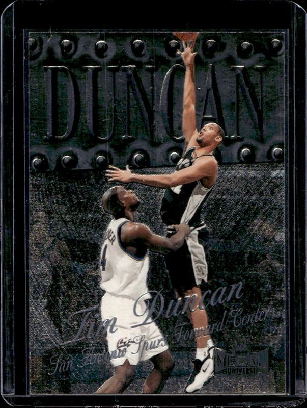 The Tim Duncan 1998 Metal Universe #35 Base card is 1 of 10 Tim Duncan's card variations in the 1998 Metal Universe set being tracked by Sports Card Investor, including Base, #35 Gem Masters /1, #15-BU Big Ups, #10-LP Linchpins, and Linchpins.