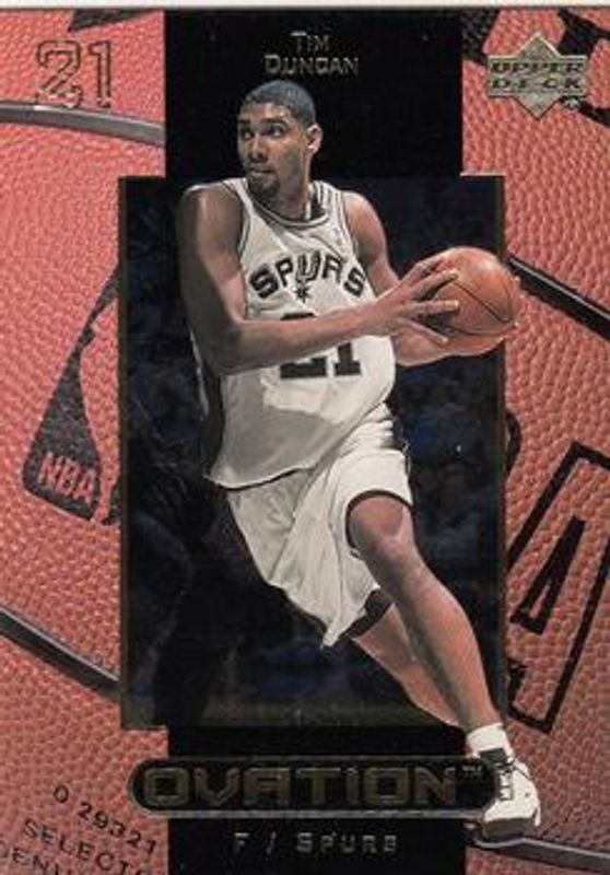 The Tim Duncan 1999 Upper Deck Ovation #48 Base card is 1 of 5 Tim Duncan's card variations in the 1999 Upper Deck Ovation set being tracked by Sports Card Investor, including Standing Ovation /50, Lead Performers, Spotlight, and Superstar Theatre.