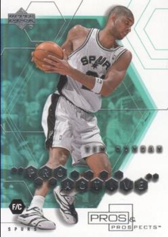 The Tim Duncan 2001 Upper Deck Pros & Prospects #PA-3 ProActive card is 1 of 4 Tim Duncan's card variations in the 2001 Upper Deck Pros & Prospects set being tracked by Sports Card Investor, including Base /1000, ProMotion, and Star Command.