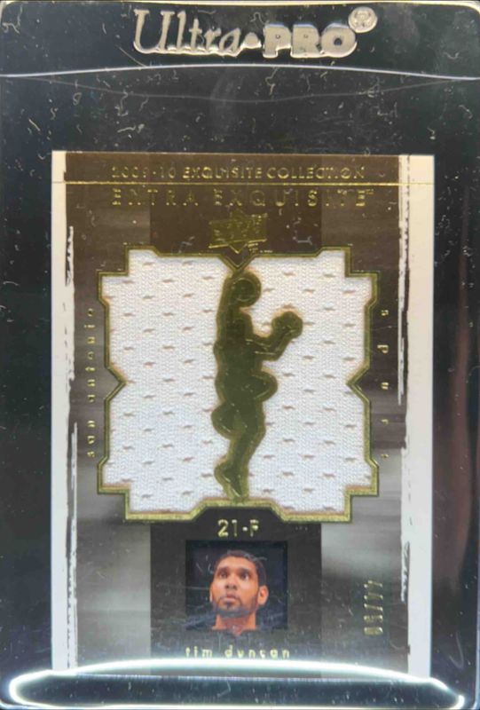 The Tim Duncan 2009 Upper Deck Exquisite Collection #X-TD Extra Exquisite Jerseys /50 card is 1 of 7 Tim Duncan's card variations in the 2009 Upper Deck Exquisite Collection set being tracked by Sports Card Investor, including Base /199, Black /1, Extra Exquisite Jerseys Gold /25, Jerseys /25, and Extra Exquisite Patches /15.
