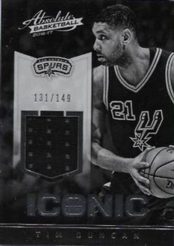 The Tim Duncan 2016 Absolute #28 Iconic - Materials /149 card is 1 of 3 Tim Duncan's card variations in the 2016 Absolute set being tracked by Sports Card Investor, including Heroes - Materials /99, and Iconic Materials - Prime /5.