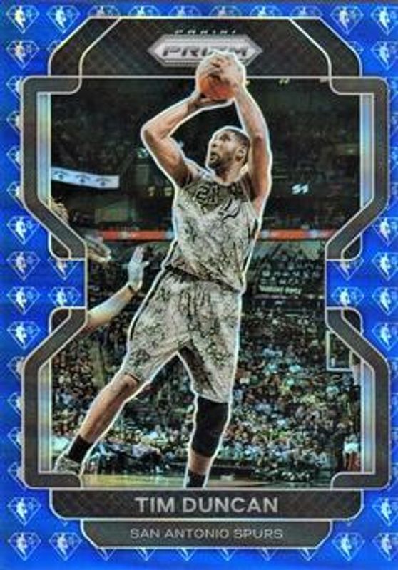 The Tim Duncan 2021 Prizm #268 Blue NBA 75th Anniversary card is 1 of 62 Tim Duncan's card variations in the 2021 Prizm set being tracked by Sports Card Investor, including Base, Blue Wave, Choice Blue Yellow Green, Factory Set Blue Hyper, and Factory Set Green Hyper.