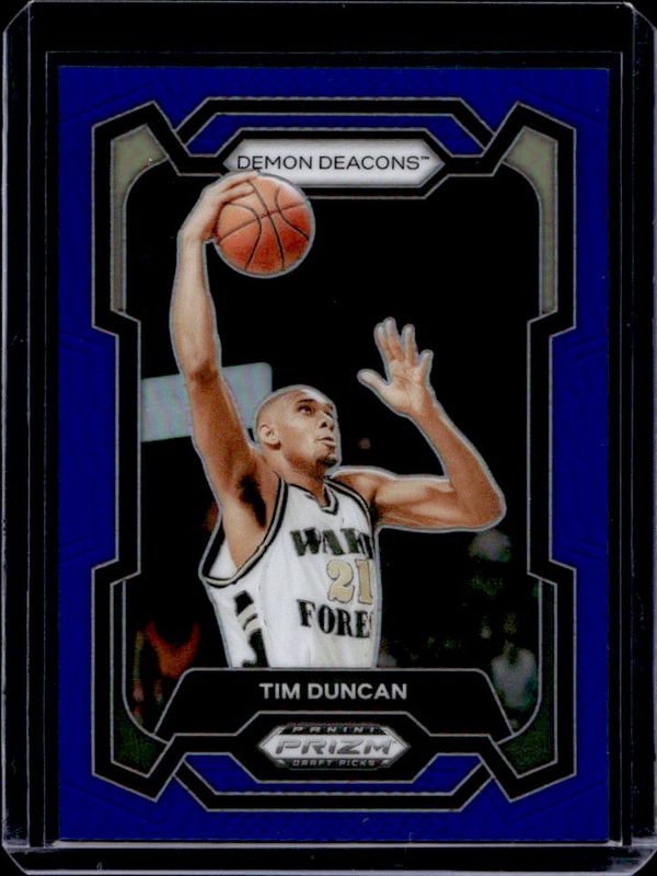 The Tim Duncan 2024 Prizm Draft Picks #63 Blue /199 card is 1 of 146 Tim Duncan's card variations in the 2024 Prizm Draft Picks set being tracked by Sports Card Investor, including #63 Base, #63b Base, #63b Green, #63 Green, and #63b Green Wave.