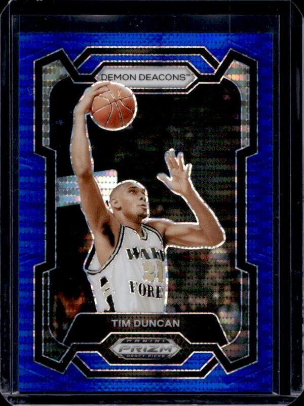 The Tim Duncan 2024 Prizm Draft Picks #63 Blue Pulsar /99 card is 1 of 146 Tim Duncan's card variations in the 2024 Prizm Draft Picks set being tracked by Sports Card Investor, including #63 Base, #63b Base, #63b Green, #63 Green, and #63b Green Wave.