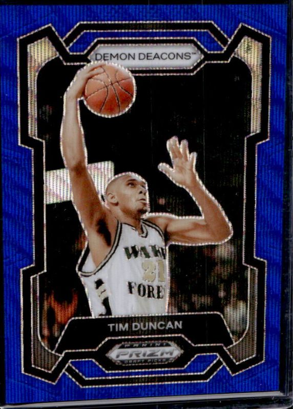 The Tim Duncan 2024 Prizm Draft Picks #63 Blue Wave /249 card is 1 of 146 Tim Duncan's card variations in the 2024 Prizm Draft Picks set being tracked by Sports Card Investor, including #63 Base, #63b Base, #63b Green, #63 Green, and #63b Green Wave.