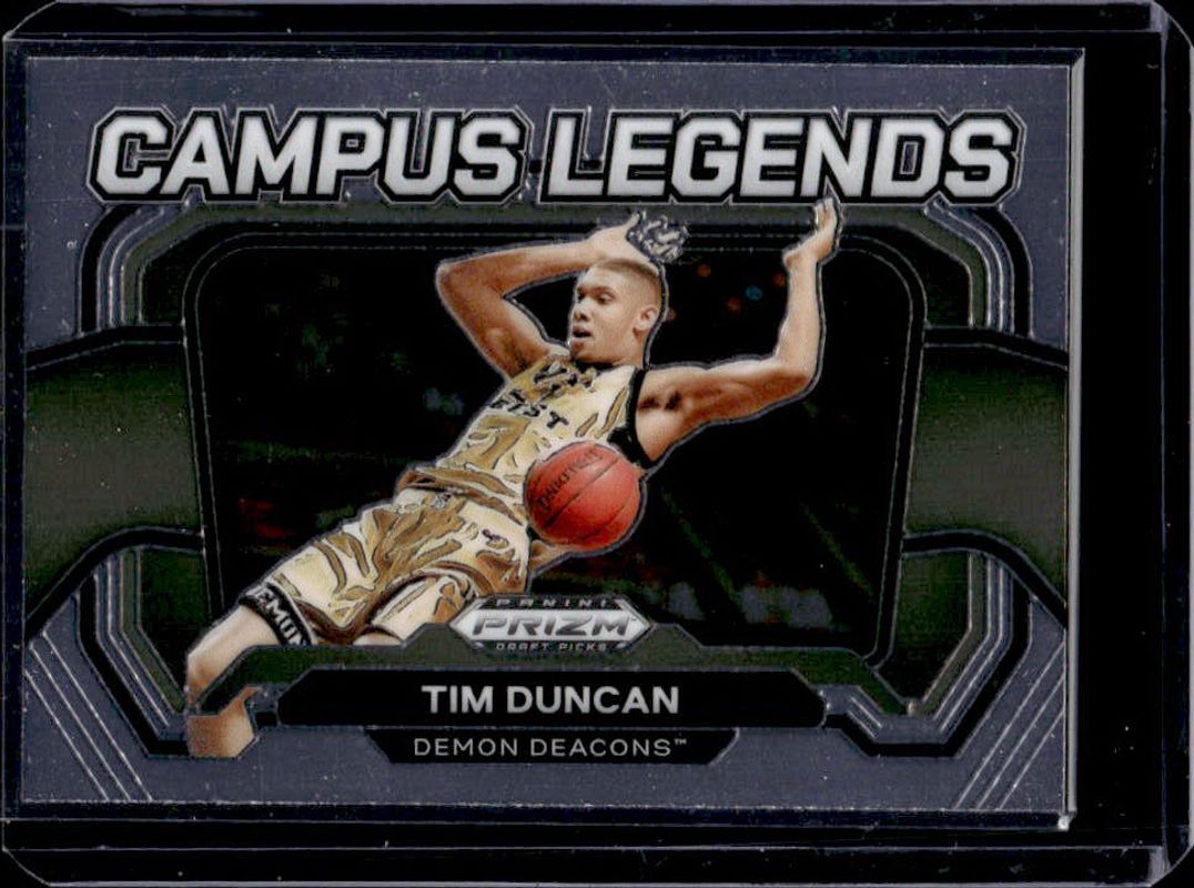 The Tim Duncan 2024 Prizm Draft Picks #1 Campus Legends card is 1 of 146 Tim Duncan's card variations in the 2024 Prizm Draft Picks set being tracked by Sports Card Investor, including #63 Base, #63b Base, #63b Green, #63 Green, and #63b Green Wave.