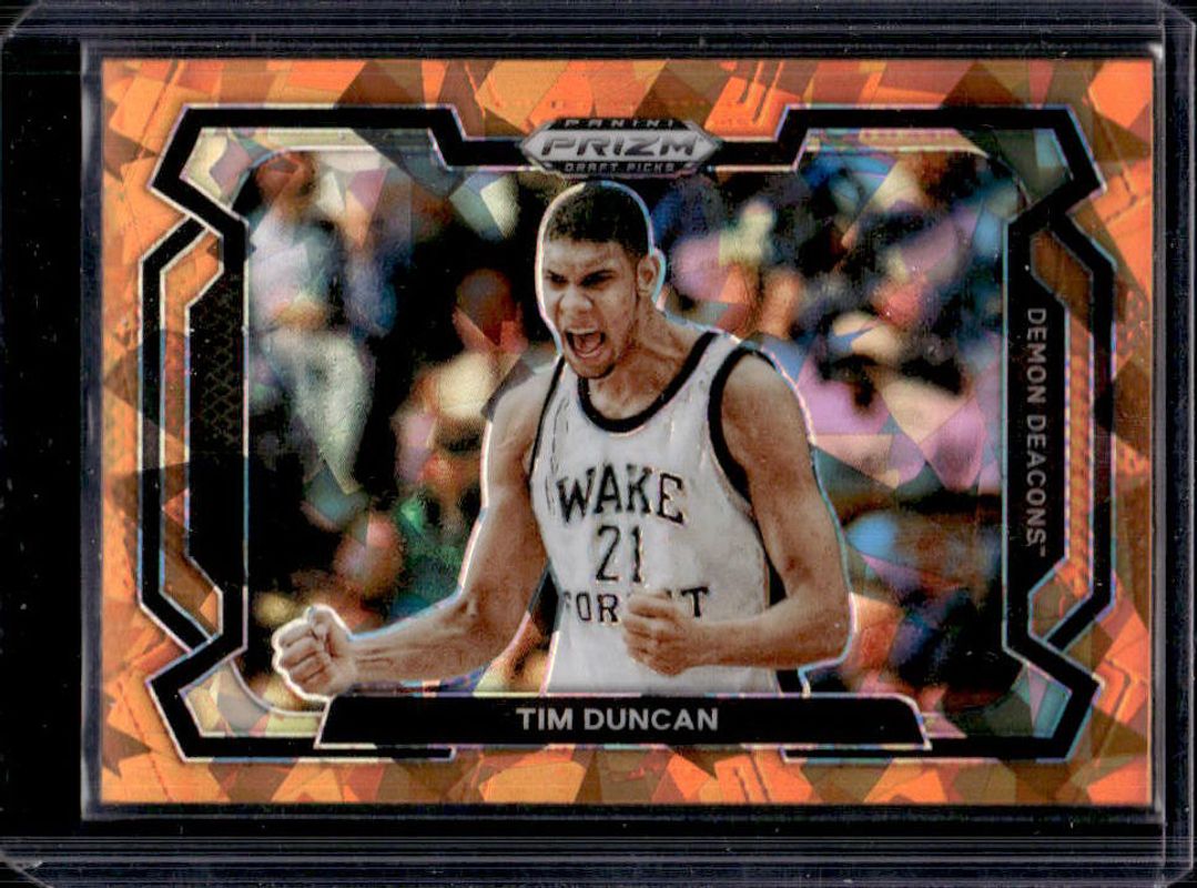 The Tim Duncan 2024 Prizm Draft Picks #63b Orange Ice card is 1 of 146 Tim Duncan's card variations in the 2024 Prizm Draft Picks set being tracked by Sports Card Investor, including #63 Base, #63b Base, #63b Green, #63 Green, and #63b Green Wave.