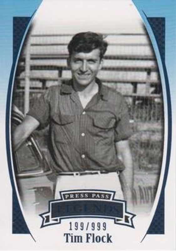 The Tim Flock 2007 Press Pass Legends #B-5 Blue /999 card is 1 of 18 Tim Flock's card variations in the 2007 Press Pass Legends set being tracked by Sports Card Investor, including Base, Solo, Bronze /599, Gold /249, and Holofoil /99.