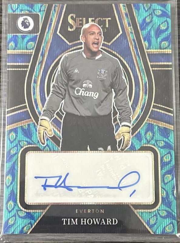The Tim Howard 2022 Select Premier League #SS-TH Select Signatures Peacock card is 1 of 8 Tim Howard's card variations in the 2022 Select Premier League set being tracked by Sports Card Investor, including Select Signatures, Select Signatures Blue Pulsar, Select Signatures Purple /5, Select Signatures Tie-Dye /4, and Select Signatures Gold /3.