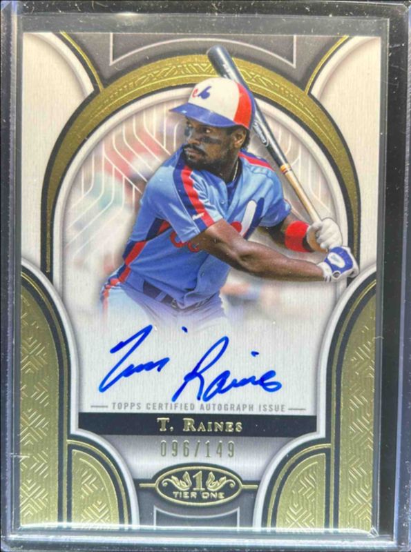 The Tim Raines 2023 Topps Tier One #PPA-TR Prime Performers Autographs /49 card is 1 of 7 Tim Raines' card variations in the 2023 Topps Tier One set being tracked by Sports Card Investor, including Tier One Relics (Design B) /400, Prime Performers Autographs - Bronze Ink /25, Tier One Relics (Design B) Dual - Patch /25, Prime Performers Autographs - Silver Ink /10, and Prime Performers Autographs - Gold Ink /1.
