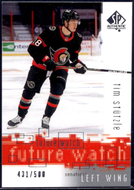 The Tim Stutzle 2020 SP Authentic #RFW-3 2000 Retro Future Watch /500 Rookie card is 1 of 15 Tim Stutzle's card variations in the 2020 SP Authentic set being tracked by Sports Card Investor, including #217 Base /999, #114 Base /999, #217 Black Gold Ink, #217 Future Watch Acetate, and #482 2020 Upper Deck Young Guns Acetate.